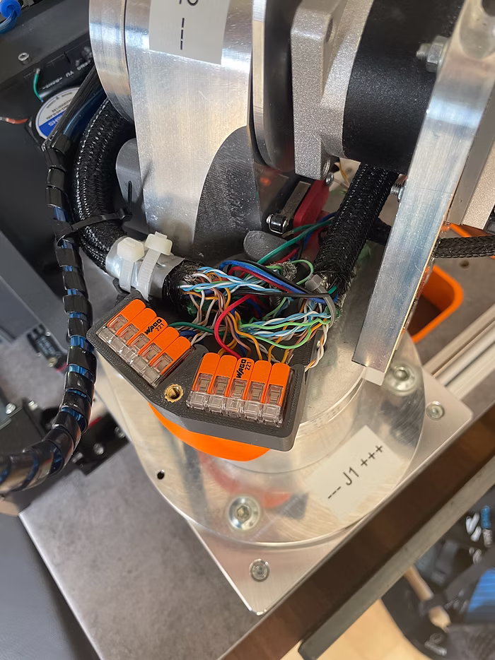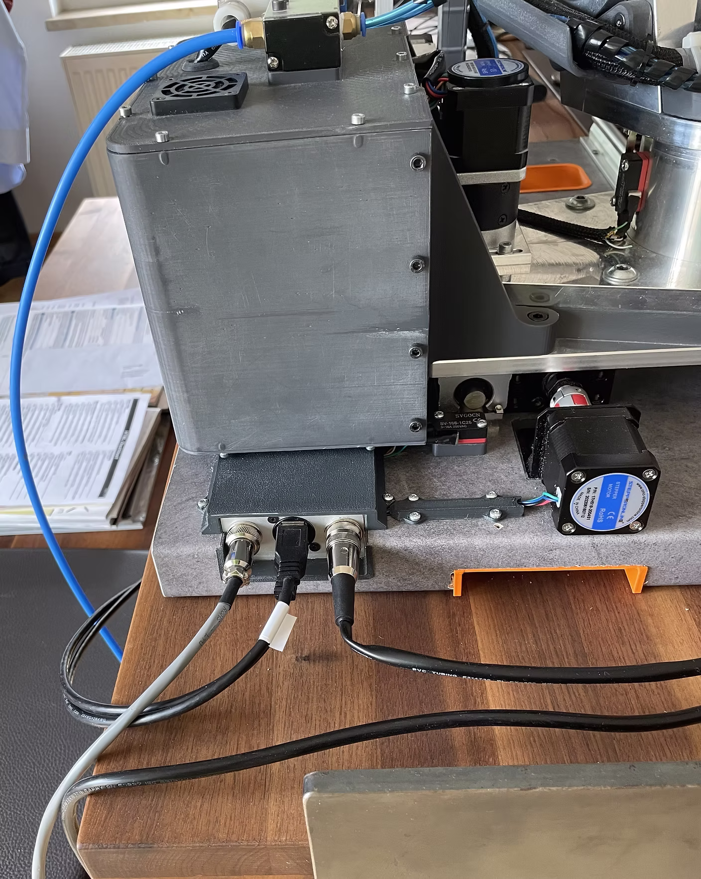 The "huge" external box is now screwed on the 7th axis plate and contains the 6 stepper drivers, the teensy4.1 and the arduino uno. On top i mounted the solenoid valve for the air gripper. The stepper driver for the 7 axis is located in connection box of the base plate.